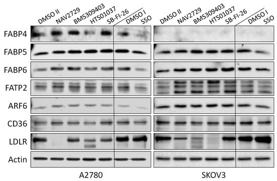 In this study, we investigated whether proteins that facilitate the uptake of FA and lipids from the tissue microenvironment into the OC cells and mediate their subsequent intracellular transport could represent additional targets for the development of potent anticancer drugs. To this end, OC cells were exposed to various inhibitors of lipid handling proteins, and the effects on cell proliferation and on corresponding target protein expression were examined in the presence or absence of the inhibitors. The names and specific binding partners/targets of the applied inhibitors are given in Table 1. Exposure to these agents induced dose- (Figure 1) and time-dependent (Supplementary Figure S1) reductions of cell numbers in A2780 (Figure 1A,B), SKOV3 (Figure 1C,D), and OVCAR3 (Figure 1E,F) cells as shown by formazan dye assay, albeit with different efficacies. In A2780, the strongest antiproliferative effects were obtained with NAV2729 (IC50 8.9 µM), followed by HTS01037 (IC50 36.5 µM), SB-FI-26 (IC50 37.0 µM), and BMS309403 (IC50 48.1 µM). The latter three showed very similar activity, whereas sulfosuccinimidyl oleate (SSO; IC50 166.8 µM) was less active (Figure 1B). In SKOV3, similar sensitivities were obtained with NAV2729 (IC50 10.3 µM), HTS01037 (IC50 35.0 µM), and BMS309403 (IC50 71.2 µM), whereas SB-FI-26 (IC50 87.0 µM) and especially SSO (IC50 271.5 µM) were hardly effective (Figure 1D). OVCAR3 cells also revealed sensitivity against NAV2729 (IC50 7.1 µM) and HTS01037 (IC50 26.8 µM), but less to SB-FI-26 (IC50 50.7 µM) and BMS309403 (IC50 60.5 µM) (Figure 1F). Overall, the FATP2/ARF6 inhibitor NAV2729 was the strongest growth inhibitor, and the group of FABP inhibitors (HTS01037, SB-FI-26, BMS309403) revealed less or roughly similar efficacy, while CD36-binding SSO was the least effective. This was seen in cells not only of the endometrioid type (A2780), but also in cells of the high-grade serous ovarian (adeno)carcinoma (HGSOC)-(OVCAR3) or mixed HGSOC/clear cell carcinoma type (SKOV3), with A2780 being the most sensitive and SKOV3 the least sensitive. It was therefore of interest to compare these two cell types in more detail. To this end, we applied Western blotting and examined the effects of these lipid import and transport inhibitors on the expression of their corresponding target proteins in A2780 and SKOV3, but not in OVCAR3. Interestingly, while none of the inhibitors affected expression of the cognate target proteins (FATP2, ARF6, FABPs, CD36), all but SSO downregulated LDLR levels in both cell lines. This decrease in LDLR can be largely attributed to accelerated protein degradation, because smaller protein fragments that were reactive with the anti-LDLR antibody were detected in Western blots of both cell lines upon exposure to some of the inhibitors (Figure 2; the uncropped Western blots are shown in Supplementary Figure S8), and in most cases, no reduction in corresponding mRNA levels was seen by RNA-seq at the transcriptomic level (except some downregulation of LDLR mRNA in SKOV3 after HTS01037 and SB-FI-26) (Supplementary Table S1, and whole RNA-Seq data set deposited in the GEO database at GSE212702). The CD36 inhibitor SSO, on the other hand, caused a slight to moderate downregulation of FABP4, FABP5, FABP6, FATP2, and ARF6 in A2780, and weak reductions in SKOV3 cells, as shown by Western blotting (Figure 2). In summary, SSO caused weak to moderate downregulation of all examined lipid handling proteins at the protein level but not at the mRNA level, except LDLR, which was slightly upregulated in both cell lines. Some drugs (e.g., NAV2729, BMS309403, and HTS01037) altered FATP2 mRNA, but this effect was only seen in SKOV3 cells and was not translated to the protein level. Overall, the data suggest a post-transcriptional mechanism of gene regulation with NAV2729, BMS309403, HTS01037, and SB-FI-26 primarily affecting LDLR levels in both cell lines, while SSO downregulates FABP proteins, FATP2, and/or ARF6 in A2780, as well as SKOV3 to a lesser extent.