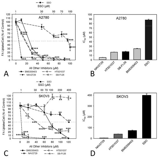 The dose-dependent effect of pharmacological inhibition of lipid handling proteins on the uptake of exogenously added free FAs in A2780 (A,B) or SKOV3 (C,D) OC cells. Cells were treated for 48 h with increasing doses of the small molecular inhibitors BMS309403, HTS01037, NAV2729, SB-FI-26, or SSO before FA uptake was ascertained by the QBT™ Fatty Acid Uptake Kit as specified in the Materials and Methods Section (A,C). Note that the concentrations of SSO are plotted on a logarithmic scale at the top of the graphs (A,C), while the concentrations of all other inhibitors are plotted on a linear scale at the bottom. Obtained dose–response curves were used to determine the drug-specific IC50 values and to find optimal drug concentrations for subsequent time course treatments (B,D). Fluorescent signals were normalized to the optical density values that were concurrently determined by formazan dye cell proliferation assays as an indirect readout for cell numbers and to the direct cell counts determined visually in a hemocytometer. Normalized data were expressed in % of solvent (0.1% DMSO)-treated controls. Means ± SD of three separate assays with replicates. ANOVA followed by Scheffe test, p < 0.05 (*), p < 0.01 (**), and p < 0.001 (***) relative to solvent-treated cells.