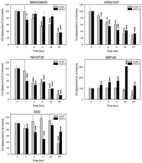 The time-dependent effect of pharmacological inhibition of lipid handling proteins on the uptake of exogenously supplied FAs in A2780 and SKOV3 OC cells. Drug concentrations close to the IC50 values for inhibition of cell growth and uptake of exogenous FA (A2780: 10 µM NAV2729, 30 µM BMS309403, 30 µM HTS01037, 30 µM SB-FI-26, and 100 µM SSO; SKOV3: 10 µM NAV2729, 80 µM BMS309403, 80 µM HTS01037, 80 µM SB-FI-26, and 200 µM SSO) were applied for time course experiments. Fluorescence signals were normalized to cell numbers that were concurrently determined by formazan dye cell proliferation assays and hemocytometer counting, and were expressed in % of solvent(0.1% DMSO)-treated control cells. Means ± SD of three separate assays with replicates. ANOVA followed by Scheffe test, p < 0.05 (*), p < 0.01 (**), and p < 0.001 (***) relative to solvent-treated cells.