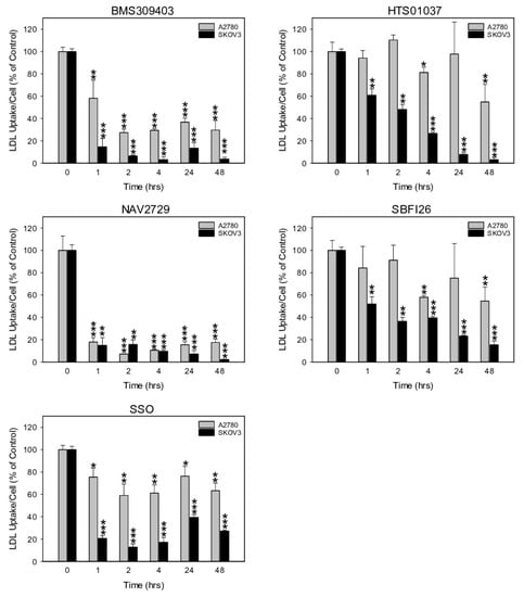 The time-dependent effect of pharmacological inhibition of lipid handling proteins on the uptake of exogenously supplied LDLs in A2780 and SKOV3 OC cells. Cells were exposed for various times to the same doses of the small molecule inhibitors BMS309403, HTS01037, NAV2729, SB-FI-26, or SSO as in Figure 4 before LDL uptake was measured with the pHrodo™ Red LDL Uptake Kit according to the procedure given in the Materials and Methods Section. Fluorescent signals were normalized to the optical density values that were concurrently determined by formazan dye cell proliferation assays as an indirect readout for cell numbers and to the direct cell counts determined visually in a hemocytometer. Normalized data were expressed in % of solvent (0.1% DMSO)-treated controls. Means ± SD of three separate assays with replicates. ANOVA followed by Scheffe test, p < 0.05 (*), p < 0.01 (**), and p < 0.001 (***) relative to solvent-treated cells.