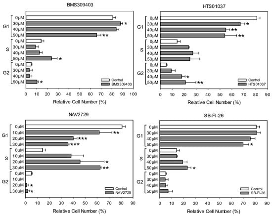 For a closer analysis of the drug-induced antiproliferative mechanisms in drug-sensitive OC cells, A2780 cells were exposed for 24 h to NAV2729, BMS309403, HTS01037, or SB-FI-26 and then subjected to cell cycle analysis using flow cytometry detection of PI-stained cells. Data given in Figure 6 reveal that NAV2729 induced a shift from G0/G1 to S and BMS309403 and HTS01037 caused a G2/M block, while SB-FI-26 only slightly decreased G0/G1 and elevated S. The histograms and dot blots from one of three separate experiments for cell cycle analysis by flow cytometry are given in Supplementary Figure S4.