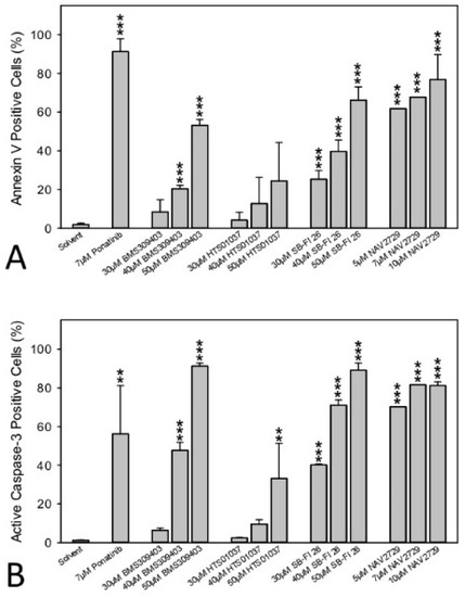 To discriminate between early and late stages of drug-induced apoptosis, two different fluorescent labeling techniques were used. The highly fluorescent allophycocyanin (APC) annexin V conjugate (Biolegend, San Diego, CA, USA) detects externalization of phosphatidylserine at the cell membranes—a process that starts very early during active apoptosis—whereas positivity for the fluorescent DNA intercalating agent propidium iodide (PI) (Sigma-Aldrich) indicates loss of membrane integrity/increase of cell permeability, which occurs during late stages of apoptosis or passive necrosis. Intermediate stages of apoptosis were examined in another set of experiments by incubation of the cells with a phycoerythrin (PE)-labeled anti-active caspase-3 antibody (#561011, Becton Dickinson, Franklin Lakes, NJ, USA). Activated caspase-3 acts as an executioner caspase. It coordinates the cellular self-destruction process by inducing DNA fragmentation and degradation of the cytoskeleton. All procedures were performed according to previous published protocols [38,39,40]. Briefly, treated and control cells seeded at a density of 36,000/cm2 in T25 cell culture flasks were harvested; rinsed with PBS; exposed to APC annexin V diluted in binding buffer containing HEPES (10 mM, pH 7.4), NaCl (140 mM), and CaCl2 (2.5 mM); rinsed again and labeled with PI (1 mg/mL). For detection of active caspase-3-positive cells, samples were fixed with formaldehyde (2%), permeabilized in methanol (100%) for 15 min at –20 °C, and stained with PE-labeled anti-active caspase-3. Labeled cells were then analyzed in a FACSCalibur flow cytometer (Becton Dickinson).