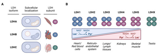 LDH isoforms and tetramers. (A) LDHA isoform, also known as the muscle (M) subunit, is localized predominantly in the cytoplasm and partly in the nucleus; LDHB isoform, also known as the heart (H) subunit, is localized in mitochondria and the cytosol; the subcellular localization of the testis-specific LDHC isoform is similar to that of the LDHA isoform (source GeneCards). (B) Tetramerization of the LDH subunits forms LDH isozymes with different affinities to substrate and organ distribution (adapted from [39,44,45,46]).