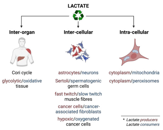 Lactate shuttling. Lactate shuttling happens between tissues, cells, or cellular compartments. (* Lactate-producing cells or compartments are in red, lactate-consuming cells or compartments in blue).