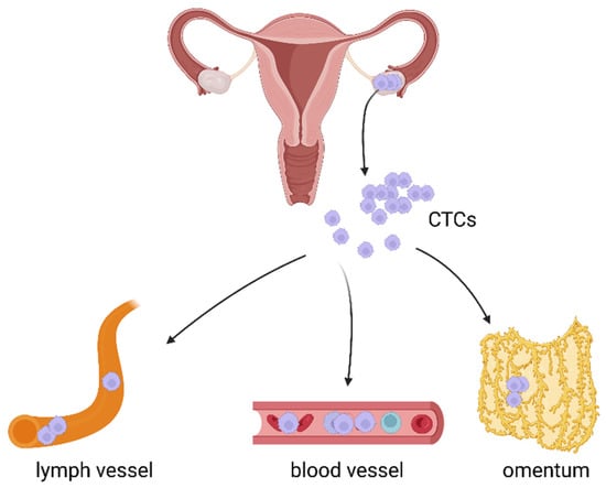 Three main routes of cancer cell dissemination: transcoelomic, hematogenous, and lymphatic. Created with https://biorender.com/, (accessed on 31 October 2022).