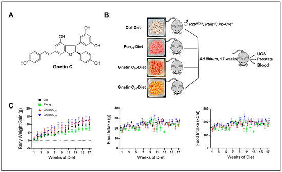 (A) Chemical structure of gnetin C, a resveratrol dimer, isolated from melinjo plant (Gnetum gnemon). (B) Schema showing the experimental design used for prostate cancer chemoprevention by diet supplementation in a precancerous R26MTA1; Pten+/f; Cre+ murine model. In total, 24 mice were fed with the control diet or diets supplemented with Pter70 (70 mg/kg diet), Gnetin C70 (70 mg/kg diet), or Gnetin C35 (35 mg/kg diet). At sacrifice, urogenital system and prostate tissues were isolated for histological and molecular analysis. Blood was also collected. (C) Effects of different diets on average body weight gain and food intake in mice. Values are mean ± SD, n = 6 per group.
