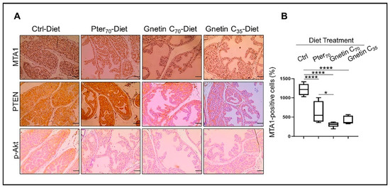 Our earlier studies using gnetin C in prostate cancer cell lines and xenografts had shown potent inhibition of the MTA1 and MTA1-associated downstream signaling targets, including proto-oncogene 2 (ETS2), Cyclin D1, and Notch 2 [31,35]. To further strengthen our previous in vivo findings on the effects of stilbenes on the MTA1/PTEN/p-Akt axis [22,34], we evaluated the expression of MTA1 and PTEN/pAkt in prostate tissues from R26MTA1; Pten+/f mice fed gnetin C diets. We found that MTA1 protein levels were significantly reduced in prostate tissues by diets supplemented with both pterostilbene and gnetin C (Figure 3A top, B). Specifically, both pterostilbene and gnetin C diets inhibited MTA1 expression in prostate tissues compared to control prostates with high significance (p < 0.0001) (Figure 3B). Moreover, despite the heterogeneity of MTA1-stained tissues in the Pter70-Diet group, the differences between Pter70-Diet and Gnetin C70-Diet groups were statistically significant. Furthermore, cytoplasmic PTEN and p-Akt staining of tissues showed a concomitant PTEN increase and p-Akt reduction in mice fed with supplemented diets compared to mice fed the control diet. Subtle differences in PTEN and p-Akt levels between the treatment groups are also evident in selected immunochemistry (IHC) images (Figure 3A, middle and bottom panels).