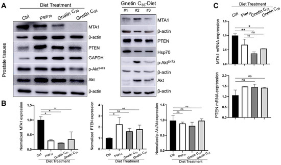 (A) Representative immunoblot images of MTA1, PTEN, and p-Akt/Akt levels in the prostate tissues from mice in different treatment groups (n = 3 per group). β-actin, GAPDH, or Hsp70 were used as loading controls (left). Immunoblot images of MTA1, PTEN, and pAkt/Akt levels in tissues from three mice (#1–3) of the Gnetin C35-Diet group (right). (B) Quantitation of the relative expression of these markers in prostate tissues from mice in different treatment groups (left). Values are mean ± SEM of data from three or more independent experiments. * p < 0.05; ** p < 0.01; (one-way ANOVA). (C) Quantitation of relative MTA1 and PTEN mRNA levels in prostate tissues from mice in different treatment groups. β-actin amplification was used as a normalization control. Changes in mRNA expression were calculated by the 2−ΔΔCt method. Values are mean ± SEM of data from three independent experiments. * p < 0.05; ** p < 0.01; (one-way ANOVA). ns, not significant.