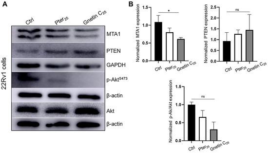 (A) Representative immunoblot images of MTA1, PTEN, and p-Akt/Akt levels in 22Rv1 prostate cancer cells treated with pterostilbene and gnetin C at 25 μM concentration. β-actin was used as a loading control. (B) Quantitation of the relative expression of these markers in prostate cancer cells. Values are mean ± SEM of data from three independent experiments. * p < 0.05; (one-way ANOVA). ns, not significant.