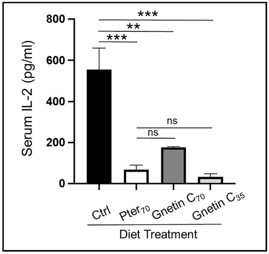 Effects of diets supplemented with gnetin C on circulating IL-2 cytokine levels measured by ELISA in murine sera (n = 3–4 per group) Data represent the mean ± SEM of three independent experiments performed in duplicate. ** p < 0.01; *** p < 0.001; (one-way ANOVA). ns, not significant.