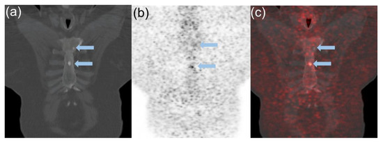 64 year old male diagnosed with Gleason Score 4 + 3 = 7 prostate cancer in 2012. Was previously treated with Bicalutamide (Casodex) and currently maintained on Lupron. At time of [68Ga]Ga-DOTATATE PET-CT, patient presented with rising PSA of 11.2 ng/mL with a doubling time of 1.8 months. Coronal images of CT (a) [68Ga]Ga-DOTATATE PET (b) and fused [68Ga]Ga-DOTATATE PET-CT (c) demonstrate mild [68Ga]Ga-DOTATATE uptake in sclerotic lesions (blue arrows; SUVmax 3.1) greater than marrow but less than liver (SUVmax of 17.3). Patient was subsequently placed on Enzalutamide with subsequent PSA response to therapy and survived to the end of study.