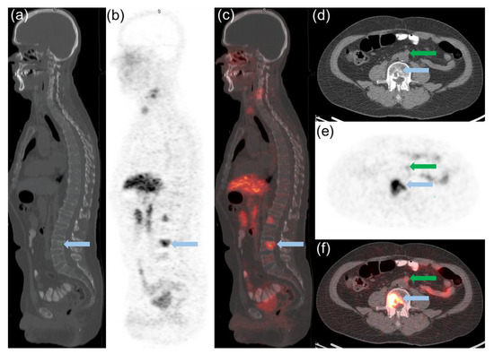51-year-old man with prostate cancer (Gleason score 9) maintained on ADT since 2011 and placed on enzalutamide four months prior to [68Ga]Ga-DOTATATE PET-CT. Selected sagittal CT (a) [68Ga]Ga-DOTATATE PET (b) and fused [68Ga]Ga-DOTATATE PET-CT (c) images show moderate [68Ga]Ga-DOTATATE uptake less than liver (SUVmax 11.8) in several osseus lesions, with the most avid L3 osseus lesion of SUVmax 10.7 (blue arrow). Transaxial CT (d) PET (e) and fused (f) [68Ga]Ga-DOTATATE PET-CT views through the L3 vertebral deposit also demonstrates a preaortic lymph node (green arrow) with mild [68Ga]Ga-DOTATATE uptake (SUVmax 3.4). Patient was switched to Docetaxel after [68Ga]Ga-DOTATATE PET-CT with initial PSA response to therapy but eventually progressed and died 20 months after [68Ga]Ga-DOTATATE PET-CT.