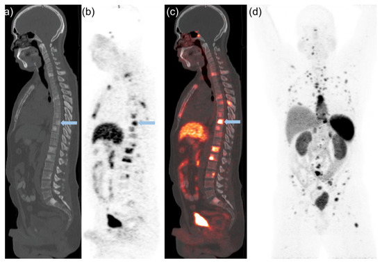 47-year-old man with Gleason score 9, mixed prostate small cell neuroendocrine carcinoma and acinar adenocarcinoma. Patient was stated on ADT and cisplatin/etoposide prior to [68Ga]Ga-DOTATATE PET-CT. Selected sagittal CT (a) [68Ga]Ga-DOTATATE PET (b) and fused [68Ga]Ga-DOTATATE PET-CT (c) images show marked [68Ga]Ga-DOTATATE uptake greater than liver (SUVmax of 14.4) in several osseus lesions with the most avid T8 lesion having a SUVmax 20.1 (blue arrow). Anterior view of [68Ga]Ga-DOTATATE PET MIP (d) demonstrates multiple [68Ga]Ga-DOTATATE and nodal metastatic deposits. Patient did not demonstrate a PSA response to therapy and passed away 4 months after [68Ga]Ga-DOTATATE PET-CT.