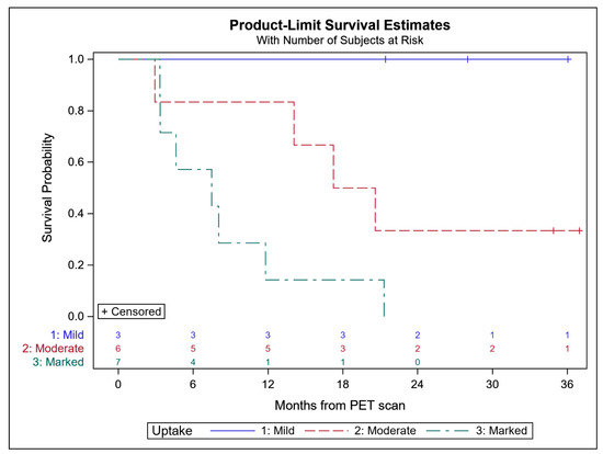 Kaplan-Meier Plots for mCRPC patients with mild, moderate, and marked [68Ga]Ga-DOTATATE uptake with a log-rank p-value of 0.01.