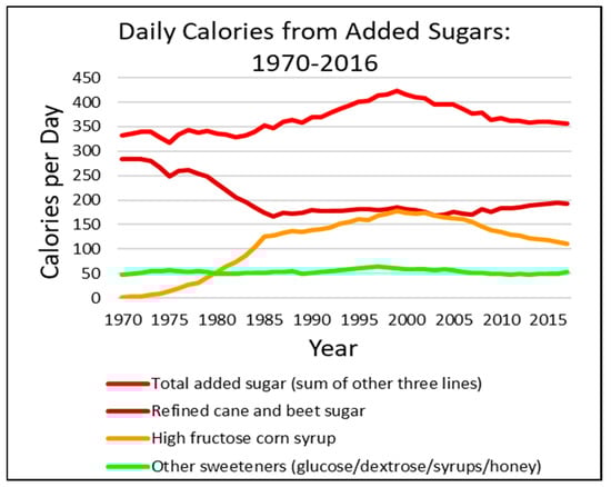 The Dietary Guidelines for Americans 2020–2025 [7], the ACS [4], and the WHO [8] recommend limiting added sugars to no more than 10% of total calories. For a 2000-calorie diet, that means about 200 calories from added sugars. The WHO has a further conditional recommendation to reduce added sugar consumption to less than 5% of calories, about 100 calories. This is more in line with the AHA recommendations of no more than 100 calories for women and 150 calories for men [6]. However, as can be seen in Figure 1, the US population consumption far exceeds even the more “generous” recommendations, consuming more than 350 calories from added sugars on average. Between the 1970s and the 1990s, there was a precipitous decrease in the consumption of refined cane and beet sugars, yet a sharp increase in high fructose corn syrup (HFCS). In the late 1990s, consumer and organizational pressures against using HFCS led to a reduction in HFCS consumption. Unfortunately, that reduction in HFCS consumption paralleled an increase in cane and beet sugars with the promise that being “natural” would be less harmful (Figure 1). Although total added sugar intake is down from 2000, total calorie intake increased from 2000 calories in 1970 to 2500 calories in 2010 (subsequent data not available). Furthermore, other calorie sources from high-glycemic-load, refined, fast-digesting carbohydrate foods (e.g., white flour, corn flower, and corn starch, etc.) have also increased, and, combined with added sugars, account for nearly 900 calories a day [5].