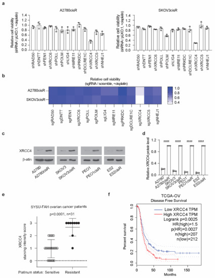 To better understand the link between the NHEJ pathway and its contribution to cisplatin resistance in ovarian cancer, we performed an NHEJ pathway-focused RNAi screen using a customized lentiviral short-hairpin RNA (shRNA) library. The screen individually targeted the 13 genes in the NHEJ pathway with a total of 64 shRNA constructs (Table S1). In the RNAi screen, 2 cisplatin-resistant cell lines, A2780cisR and SKOV3cisR, were transduced with the lentivirus pool containing shRNAs targeting each of the 13 individual genes before the treatment of the sublethal doses of cisplatin. Among the 13 genes examined, XRCC4 was identified as the most effective target that commonly and strongly sensitized the ovarian cancer cells to cisplatin treatment (Figure 1a). To exclude the possibility of an off-target effect by RNAi screen, a sgRNA-based screen was also performed. Cas9-expressing cell lines, A2780cisR and SKOV3cisR, were infected with the lentivirus pool containing sgRNAs targeting each of the 13 individual genes and treated with cisplatin (Supplementary Table S1). As shown in Figure 1b, XRCC4 loss attenuated the cell viability to the most in both cell lines upon cisplatin treatment, suggesting XRCC4 in the NHEJ pathway specifically plays an important role in conferring cisplatin resistance. Moreover, a strong increase in the XRCC4 expression was observed in a panel of four cisplatin-resistant ovarian cell lines relative to the paired parental cell lines (Figure 1c,d). Furthermore, XRCC4 expression and its relationship to cisplatin resistance were further examined in the primary ovarian cancer patient tumor who received platinum-based chemotherapy (Supplementary Table S2). Ovarian cancer patients were stratified into two groups: the sensitive group (n = 22, patients who responded to platinum-based chemotherapy durably for at least 6 months) and the resistant group (n = 9, patients who relapsed within the 6 months and did not respond to platinum therapy). A significantly higher expression level of XRCC4 was observed in the primary ovarian cancer tumor samples from the resistant group than from the sensitive group (Figure 1e). In addition, through the analysis of the TCGA-OV database, we also identify that high expression of XRCC4 significantly correlated with poor disease-free survival, implying XRCC4 expression possibly contributes to the resistance to platinum-based chemotherapy (Figure 1f). Intriguingly, the expression level of other genes in the NHEJ pathway did not exhibit a significant correlation with disease-free survival of ovarian cancer patients (Appendix A, Figure A1). Taken together, these data demonstrate that XRCC4 expression level positively correlates with cisplatin resistance in ovarian cancer cells.
