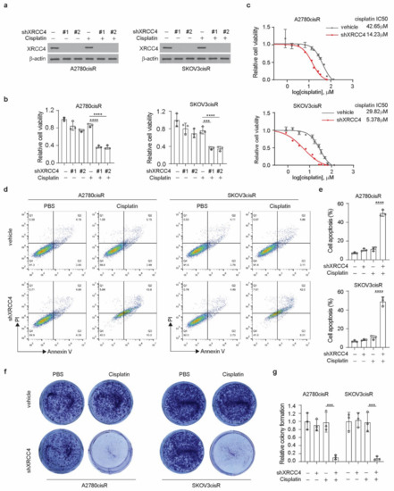 To study the role of XRCC4 in the response to cisplatin in ovarian cancer cells, we stably knocked down XRCC4 using two distinct shRNA clones in both the A2780cisR and SKOV3cisR cell lines. Successful knockdown of the XRCC4 was confirmed by the Western blot (Figure 2a). We observed that while the knockdown of XRCC4 alone did not significantly decrease the cell viability, the combination of XRCC4 knockdown and cisplatin treatment significantly attenuated the cell viability, suggesting the role of XRCC4 in sensitizing the cytotoxic effect of cisplatin in the ovarian cancer cells (Figure 2b). Consistent with the decreased cell viability, the IC50 of cisplatin in the XRCC4 knockdown cells was also significantly lower than in the control cells (Figure 2c). A similar pattern was also observed in ES2cisR and PEO1cisR upon XRCC4 knockdown (Figure A2a,b). Moreover, using FACS assay to monitor the cell apoptosis, we also found that the loss of XRCC4 robustly induced more cell death in the ovarian cancer cells treated with cisplatin (Figure 2d,e). A similar trend was also observed in the colony formation; the combination of XRCC4 knockdown and cisplatin treatment strongly abolished the colony formation potential in the cisplatin-resistant ovarian cancer cell lines, supporting the role of XRCC4 in the regulation of cisplatin sensitivity (Figure 2f,g). These data reveal that XRCC4 promotes cisplatin-resistant potential and that targeting XRCC4 sensitizes cisplatin-resistant ovarian cancer cells to cisplatin.