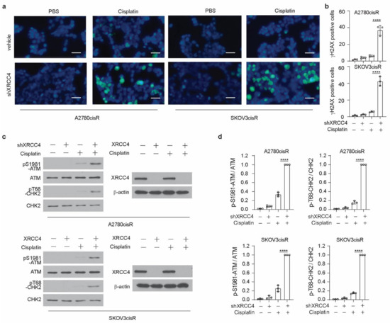 XRCC4 loss significantly induced DNA damage in cisplatin-resistant ovarian cells upon cisplatin treatment. (a,b) Representative immunofluorescence staining (a) of γH2AX (green) and DAPI (blue) and related quantification (b) in the indicated cells (treatment: cisplatin, 5 μg/mL A2780cisR, and 2 μg/mL SKOV3cisR for 48 h). Percentages of γH2AX-positive cells were quantified and are shown in the bar plots separately. Scale bar, 100 μm. (c,d) Representative blot (c) and quantification (d) of DNA damage checkpoint proteins in the indicated cells by Western blot (treatment: cisplatin, 5 μg/mL A2780cisR, and 2 μg/mL SKOV3cisR for 24 h). Indicated protein expression levels were quantified by ImageJ and are shown in the bar plots separately. Data are mean ± SD from 3 technical replicates of each sample and are representative of 2 (a) and 2 (c) independent biological experiments. Statistical analysis was performed by 1-way ANOVA for all data (**** p < 0.0001).