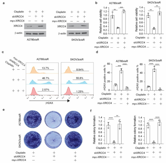 Rescued expression of XRCC4 reduced DNA damage in cisplatin-resistant ovarian cells upon cisplatin treatment. (a) Confirmation of the rescued expression of XRCC4 in the XRCC4 knockdown A2780cisR and SKOV3cisR by Western blot. (b) Cell viability of control, XRCC4 knockdown, and XRCC4 rescued A2780cisR and SKOV3cisR cells treated with the sublethal doses of cisplatin (5 μg/mL A2780cisR and 2 μg/mL SKOV3cisR) for 48 h. Cell viability was determined by CellTiter-Glo luminescent cell viability assay. (c,d) FACS analysis (c) and quantification (d) of γH2AX level in the indicated cells (treatment: cisplatin, 5 μg/mL A2780cisR, and 2 μg/mL SKOV3cisR for 48 h). (e,f) Colony formation potential (e) and quantification (f) of the indicated A2780cisR and SKOV3cisR. Cells were treated with the sublethal doses of cisplatin (5 μg/mL A2780cisR and 2 μg/mL SKOV3cisR) for 48 h. Data are mean ± SD from 3 technical replicates of each sample and are representative of 2 (a), 2 (b), and 3 (c–e) independent biological experiments. Statistical analysis was performed by 1-way ANOVA for all data; ** p < 0.01; *** p < 0.001; **** p < 0.0001.