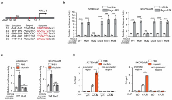 cJUN mediated the upregulation of XRCC4 in cisplatin-resistant ovarian cells treated with cisplatin (a) Schematic illustration of cJUN binding sites in the XRCC4 promoter. The wild-type (wt) and corresponding mutation sequences for each XRCC4 promoter-luciferase plasmids were provided (b) Analysis of the indicated XRCC4 promoter-luciferase activity in A2780cisR and SKOV3cisR cells transfected with control or cJUN overexpressing vector by luciferase activity assay. (c) Analysis of the indicated XRCC4 promoter-luciferase activity in A2780cisR and SKOV3cisR cells treated with PBS or cisplatin by luciferase activity assay. Treatment: cisplatin (5 μg/mL A2780cisR and 2 μg/mL SKOV3cisR) for 48 h (d) Analysis of cJUN binding to XRCC4 promoter region in A2780cisR and SKOV3cisR cells treated with PBS or cisplatin by ChIP. The IgG was used as control of cJUN antibody. The nonpromoter region of XRCC4 was also parallelly compared. Treatment: cisplatin (5 μg/mL A2780cisR and 2 μg/mL SKOV3cisR) for 48 h. Data are mean ± SD from 3 technical replicates of (b–d). Data are representative of 2 (b), 2 (c), and 2 (d), independent biological experiments. Statistical analysis was performed by 1-way ANOVA for all data; ns, not significant; ** p < 0.01; *** p < 0.001; **** p < 0.0001.