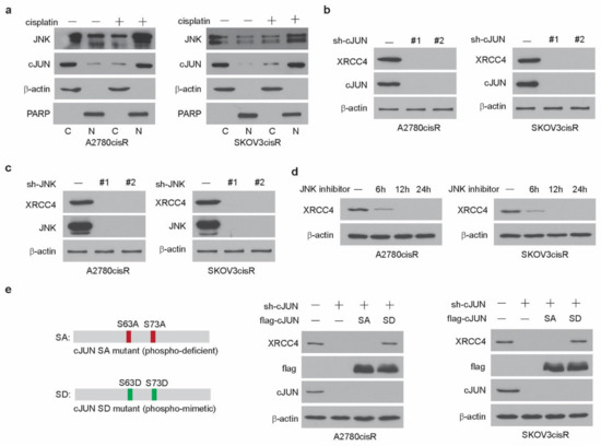 JNK-cJUN axis activated by cisplatin promotes XRCC4 expression in the cisplatin-resistant ovarian cancer cells (a) Localization of cJUN and JNK in cells treated with cisplatin. Treatment: cisplatin (5 μg/mL A2780cisR and 2 μg/mL SKOV3cisR) for 48 h. β-Actin and PARP were used as cytoplasmic and nuclear markers, respectively. C, cytosol, N, nucleus. (b,c) Detection of the level of XRCC4 by Western blot in A2780cisR and SKOV3cisR cells with/without the knockdown of cJUN (b) and JNK (c), respectively. Cells were treated with cisplatin. Treatment: cisplatin (5 μg/mL A2780cisR and 2 μg/mL SKOV3cisR) for 48 h. (d) Detection of the level of XRCC4 by Western blot in A2780cisR and SKOV3cisR cells treated with JNK inhibitor in a time-dependent manner. Cells were cotreated with cisplatin. Treatment: cisplatin (5 μg/mL A2780cisR and 2 μg/mL SKOV3cisR). (e) Left: Schematic illustration of cJUN SA (S63A/S73A) or SD (S63D/S73D) overexpression plasmid. Right: detection of the level of XRCC4 by Western blot in A2780cisR and SKOV3cisR cells with endogenous cJUN removed and rescued by cJUN SA or cJUN SA mutants. Data are representative of 2 (a), 3 (b), 2 (c), 3 (d), and 2 (e) independent biological experiments.