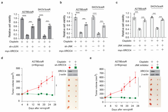 We demonstrated that the knockdown of XRCC4 sensitized cisplatin treatment and the JNK-cJUN axis promotes the upregulation of XRCC4 to confer cisplatin resistance in ovarian cancer cells. Targeting the JNK-cJUN-XRCC4 would presumably hold the potential clinical translation of overcoming cisplatin resistance in ovarian cancer. However, the specific inhibitor of XRCC4 is not commercially available to our knowledge; the possible target strategy could be the inhibition of the JNK-cJUN pathway to control the level of XRCC4. First, we observed that knockdown of cJUN or JNK indeed significantly sensitized cisplatin treatment and forced overexpression of XRCC4 partially restored the cell viability, suggesting XRCC4 acted downstream of JNK-cJUN axis to promote cisplatin resistance (Figure 7a,b). Meanwhile, forced expression of XRCC4 also reduced the cisplatin-sensitizing effect of the JNK inhibitor (Figure 7c), further supporting that the pharmaceutical inhibition of JNK increased cisplatin sensitivity at least partly through the suppression of the XRCC4 expression. Next, we examined the effect of inhibition of the JNK-cJUN-XRCC4 pathway in sensitizing cisplatin treatment in vivo using the A2780cisR cell line xenograft mouse model. As shown in Figure 7d, the knockdown of XRCC4 significantly attenuated the tumor growth relative to the control under the treatment of cisplatin, suggesting XRCC4 loss sensitizing cisplatin treatment in vivo. More importantly, we also found that pharmaceutical inhibition of JNK significantly led to the downregulation of XRCC4 in the tumor cells and suppressed the tumor growth in the in vivo model (Figure 7e), indicating the important role of JNK-cJUN-XRCC4 in the response of cisplatin-resistant ovarian cancer cells to cisplatin treatment. These results strongly support that JNK-cJUN-XRCC4 could be targeted to overcome cisplatin resistance in ovarian cancer.