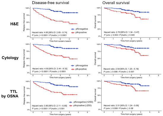 | pN stage H&E | N1/N2 vs. N0 | 4.85 (2.69–8.74) | <0.0001 | 4.27 (2.14–8.49) | <0.0001 | 2.70 (1.34–5.47) | 0.004 | 2.25 (1–5.08) | 0.049 |