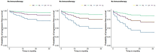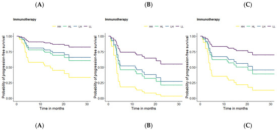 Some of the previously presented results should be highlighted at this point for a better understanding of the following figure. Age, SUVmax, volume, TLG, the presence of lymphangiosis through imaging, and clinical stage IV were suggested by the performed multivariate prediction model as strong predictors for a lasting response to ICIs treatment, with the presence of lymphangiosis through imaging and clinical stage IV having the strongest negative effect on survival. Since age and TLG could be interpretated as correction factors rather than as predictors in the presented prediction model, we aimed at illustrating the negative effect of SUVmax, volume, the presence of lymphangiosis through imaging, and clinical stage IV using mean age and mean TLG in all the survival curves. For this purpose, a method that enables us to display the influence of the continuous and categorical predictors on PFS in the same figure was required. Therefore, patients with ICI treatment vs. no ICI treatment were divided into four subgroups, depending on whether the considered variable (SUVmax and volume) was lower or higher than the corresponding predefined cut-off value: HH = patients with a SUVmax and volume of primary tumor higher than their respective cut-off-values (yellow). HL = patients with a SUVmax higher and a volume of primary tumor lower than the respective cut-off-value (green). LH = patients with a SUVmax lower and a volume of primary tumor higher than the respective cut-off-value (blue). LL = patients with a SUVmax and volume of primary tumor lower than their respective cut-off-values (purple). Survival curve A displays the influence of the continuous predictors (SUVmax and volume) on PFS (in months) without any categorical predictor (lymphangiosis and clinical stage IV). For this reason, survival curve A can be seen as a reference with regard to the influence of the categorical predictors. Survival curve B displays the influence of lymphangiosis through imaging at any clinical stage lower than IV on PFS (in months) in addition to the continuous predictors (SUVmax and volume). Survival curve C displays the influence of clinical stage IV without lymphangiosis through imaging on PFS (in months) in addition to the continuous predictors (SUVmax and volume). When comparing survival curves A, B, and C, a significant reduction in the probability of PFS could be observed in survival curves B and C, particularly in survival curve B, highlighting the strong negative effect of lymphangiosis through baseline imaging on long-term survival, as much as clinical stage IV (Figure 1).