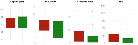 Box plots of the significant predictors for long-term responses in patients treated with ICI (red) vs. no ICI (green). (A) Age in years (p = 0.64); (B) SUVmax unitless (p = 0.09); (C) volume in cm3 (p < 0.01), and (D) TLG (unitless) (p = 0.13).