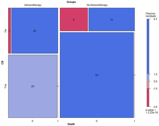 Mosaic plots displaying clinical benefit (CB) and mortality rate in NSCLC patients treated with ICI vs. no ICI.