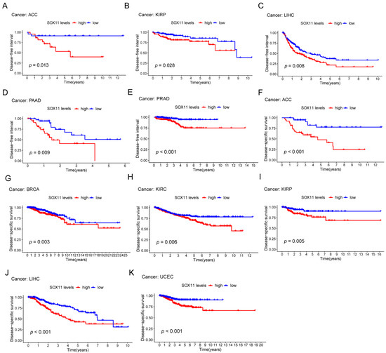 The Kaplan–Meier analysis of the correlations between the SOX11 expression and DFS and DSS. (A–E) The Kaplan–Meier survival analysis shows the impact of SOX11 expression on DFS. (F–K) The Kaplan–Meier survival analysis shows the impact of SOX11 expression on DSS. The red line indicates a high SOX11 expression group, and the blue line indicates a low SOX11 expression group.