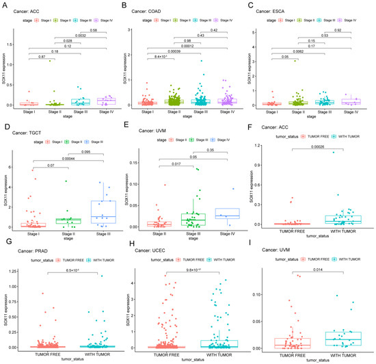We compared the differences in SOX11 expression levels at different tumor stages. In ACC (Figure 5A), COAD (Figure 5B), ESCA (Figure 5C), TGCT (Figure 5D) and UVM (Figure 5E), the expression of SOX11 showed an increasing trend with increasing tumor stage. It has also been known that post-treatment tumor status was strongly associated with disease recurrence. We found that high expression of SOX11 was significantly associated with tumor status in ACC (Figure 5F), PRAD (Figure 5G), UCEC (Figure 5H) and UVM (Figure 5I).