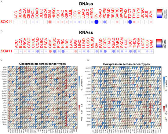 Analysis of the relationship between SOX11 expression and stemness and EMT-related genes in cancers. (A) The correlation between SOX11 expression and DNAss in different cancers. The red dots indicate positive correlations, while the blue dots denote negative correlations. DNAss, DNA stemness score (B) The correlation between SOX11 expression and RNAss in different cancers. RNAss, RNA stemness score (C) Correlation heatmap showing the relationship between SOX11 expression and EMT-related genes expression. For each pair, the top left triangle indicates the p-value, and the bottom right triangle denotes the correlation coefficient. (D) Correlation heatmap showing the relationship between SOX11 expression and cancer stem cell markers * p < 0.05, ** p < 0.01, and *** p < 0.001. Cor, correlation coefficient.