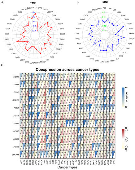Analysis of the associations of SOX11 expression with TMB, MSI and MMR genes. (A) Radar map reflecting the correlation between the SOX11 expression and TMB. (B) Radar map reflecting the correlation between the SOX11 expression and MSI. (C) Correlation heatmap showing the relationship between SOX11 expression and MMR genes. For each pair, the top left triangle indicates the p-value, and the bottom right triangle denotes the correlation coefficient * p < 0.05, ** p < 0.01, and *** p < 0.001. Cor, correlation coefficient.