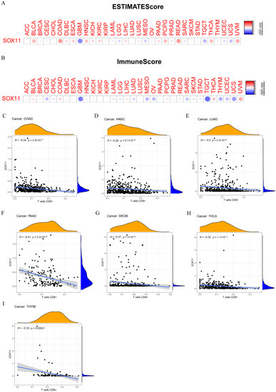 Currently, the predictive role of SOX11 in the tumor immune microenvironment remains unknown. Here, the correlation between SOX11 expression and the tumor immune microenvironment was assessed using the ESTIMATE method. Our results showed that SOX11 expression was positively correlated with the ESTIMATE scores in BLCA, COAD, PCPG, READ, THCA and UVM, as well as immune scores (Figure 9A,B). We also explored the relationship between SOX11 expression and immune cell infiltration in pan-cancer. The results showed that SOX11 expression correlated with the level of infiltration of all 15 immune cell types, including B cells, plasma cells, CD4+ T cells, CD8+ T cells, M0 macrophages, M1 macrophages, M2 macrophages, monocytes, NK cells, neutrophils, follicular helper T cells, γΔT cells, Treg cells, dendritic cells, and mast cells (Figure S2). We found that in COAD, HNSC, LUAD, PAAD, SKCM, THCA and THYM, the infiltration levels of CD8+ T cells were all significantly negatively correlated with the expression levels of SOX11 (Figure 9C–I).