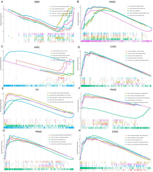 The Gene Set Enrichment Analysis (GSEA) in Kyoto Encyclopedia of Genes and Genomes (KEGG) signature of GBM, HNSC, KIRC, LUSC, OV, PAAD, PRAD and STAD. The curves with different colors indicate the different pathway annotations. Peaks in the upward direction indicate positive regulation by SOX11 and peaks in the downward direction represent negative regulation by SOX11. (A) The GSEA analysis of SOX11-mediated biological process in GBM; (B) The GSEA analysis of SOX11-mediated biological process in HNSC; (C) The GSEA analysis of SOX11-mediated biological process in KIRC; (D) The GSEA analysis of SOX11-mediated biological process in LUSC; (E) The GSEA analysis of SOX11-mediated biological process in OV; (F) The GSEA analysis of SOX11-mediated biological process in PAAD; (G) The GSEA analysis of SOX11-mediated biological process in PRAD; (H) The GSEA analysis of SOX11-mediated biological process in STAD.