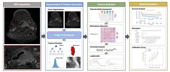 Our study has several limitations that merit consideration. First, the reliance on manually selected slices made the extraction of MRI radiomic features labor-intensive, time-consuming, and prone to intra- and inter-observer variability [,]. Future studies with deep-learning-based automated segmentation techniques should work to address this limitation. Second, a certain degree of technical variability and the potential occurrence of image artifacts are still a concern in the field of radiomics. Previous studies have shown that image noise and texture may be affected by variations in MRI acquisition parameters [,,,]. Additionally, head and neck MRI is prone to swallowing-related motion artifacts. Collectively, these potential confounders may affect the prognostic value of the extracted radiomic features. Third, we solely focused on features extracted from post-contrast T1-weighted images, and other MRI sequences were not taken into account. Future research should include additional MRI sequences or multiple imaging modalities to examine a higher number of features. Fourth, it is also possible that the small sample size may have limited the power to detect significant associations and, for that reason, larger prospective cohort studies are required. Finally, the single-center design might have limited the external validity of the results. The prognostic value of our tools needs to be independently tested in larger, longitudinal investigations.