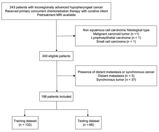 We retrospectively reviewed the clinical records of patients with newly diagnosed hypopharyngeal cancer who presented at the Chang Gung Memorial Hospital, Taoyuan, Taiwan, between August 2006 and September 2015. Inclusion criteria were as follows: (1) pathologically proven diagnosis of advanced hypopharyngeal cancer, (2) availability of pretreatment contrast-enhanced head and neck MRI, and (3) curative-intent treatment with primary CCRT according to the National Comprehensive Cancer Network guidelines []. Patients with histology types different from squamous cell carcinoma and those with second primary tumors or synchronous cancers were excluded, as were those with metastatic disease. Demographic data (including age and sex), tumor differentiation and information on clinical stages (including T stage, N stage, and overall stage) were collected in all participants. Disease staging was performed using the American Joint Committee on Cancer (AJCC) Staging Manual, Seventh Edition. A detailed description of the CCRT protocol is reported in Appendix A. For model training and validation, the study participants were divided (2:1 ratio) into a training cohort and a testing cohort.
