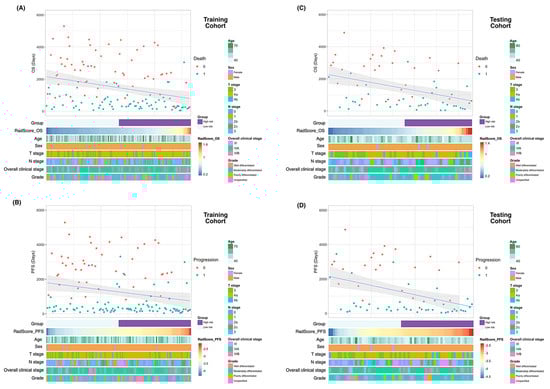 Heatmaps of clinicopathological characteristics and survival outcomes in patients stratified according to RadScores. Patients are displayed in an ascending order with respect to RadScores. Differences in overall survival and progression-free survival in the training (A and B, respectively) and testing (C and D, respectively) cohorts. Abbreviations: OS—overall survival; PFS—progression-free survival.