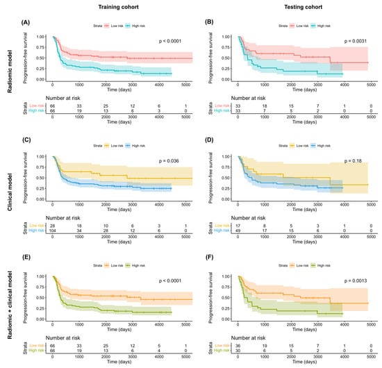 Kaplan–Meier progression-free survival plots in the training (A,C,E) and testing (B,D,F) cohorts stratified according to the predicted risk derived from radiomic models (A,B), clinical models (C,D), and combined radiomic–clinical models (E,F). p values were calculated using log-rank tests.