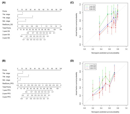 Nomograms used for the prediction of overall survival (A) and progression-free survival (B) in patients with hypopharyngeal cancer who had been treated with primary chemoradiotherapy. Calibration curves were applied to assess the predictive performance with respect to 1-, 2-, and 3-year overall survival (C) and progression-free survival (D) in the training cohort. The survival outcomes predicted by the nomogram are plotted on the x-axis, whereas the observed outcomes are reported on the y-axis. The gray lines denote ideal nomograms. The vertical bars are the 95% confidence intervals, whereas unfilled square box markers indicate bootstrap-corrected estimates. Abbreviations: OS—overall survival; PFS—progression-free survival.