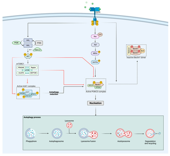 Schematic representation of the regulation of autophagy by the EGFR and PI3K/Akt pathways. Activation of EGFR stimulates the PI3K/Akt pathway, which in turn negatively regulates autophagy activation via different ways: (i) Akt and mTORC1 inhibit the PI3KC3 complex through phosphorylation and (ii) Akt and mTORC1 suppress the activity of the ULK1 complex, hereby preventing autophagy initiation. The Ras/Raf/MAPK pathway, activated by EGFR, positively regulates the autophagic response through phosphorylation of Beclin1, whereas activated EGFR itself negatively regulates autophagy by binding to Beclin1, followed by homodimerization of Beclin1 and the binding of two autophagy suppressors, Rubicon and Bcl2, rendering the complex inactive. When both the ULK1 and PI3KC3 complex are released from their inhibitory signals, nucleation will be initiated, leading to further expansion of the phagophore. The figure was created with BioRender.com (accessed on 23 October 2022).