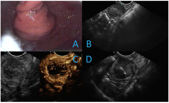 Endoscopic and EUS images of the case from our Center. Panel (A) endoscopic view of the gastric bulging of the seeding; Panel (B) EUS measurement of the seeding nodule; Panel (C) contrast enhancement of the seeding nodule; Panel (D) fine-needle aspiration of the lesion.