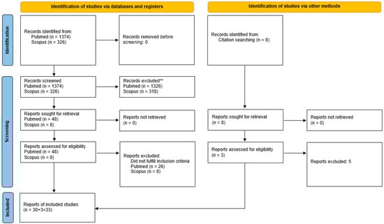 The search initially retrieved 1374 results from Pubmed and 326 results from Scopus. After a screening of titles and abstracts, 30 reports (either case reports or series) were selected from Pubmed with no additional reports from Scopus. Another 3 reports were identified from hand-searching of the references of the selected manuscripts and included, for a total of 33 reports [11,17,19,21,22,23,24,25,26,27,28,29,30,31,32,33,34,35,36,37,38,39,40,41,42,43,44,45,46,47]. (Figure 2).