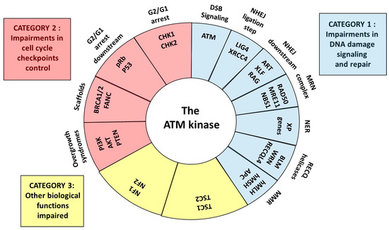 Schematic view of the central role of ATM as a kinase and partner for the proteins whose mutations cause cancer and radiosensitivity syndromes. Three categories can be defined: syndromes due to some impairments in DNA damage signaling and repair, some impairments in cell cycle checkpoint control and to other impaired biological functions.