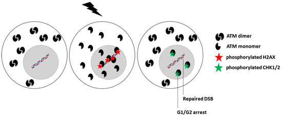 While the upstream action of the ATM protein in the predominant DNA damage repair and signaling pathways, notably in NHEJ, suggests a nuclear sublocalization, some authors have reported that ATM is also a cytoplasmic protein [22,243,244,245]. By analyzing hundreds of fibroblast cell lines derived from cancer patients eliciting a large spectrum of post-radiotherapy radiosensitivity, it appears that IR triggers a drastic change in the subcellular localization of ATM. As evoked above, in quiescent cells, after exposure to IR, the cytoplasmic ATM dimers dissociate as ATM monomers and diffuse in the nucleus. Once in the nucleus, ATM monomers phosphorylate H2AX histone protein (γH2AX), which triggers the activation of NHEJ [20,21,22]. However, in the nucleus, ATM monomers also phosphorylate some other ATM substrates such as MRE11 (which limits the nuclease activity of the RAD50–MRE11–NBS1 complex evoked above) and CHK1 and CHK2 proteins (which trigger cell cycle arrest in G2/M and G1, respectively) [15,20]. Nevertheless, in cells that show moderate but significant radiosensitivity, RIANS is delayed by the overexpression of cytoplasmic substrates of ATM, which sequestrate the RI ATM monomers in the cytoplasm. Such a model was confirmed by both immunoblots and proximity ligation assays [20,21,246]. These ATM substrates, called X-proteins, are generally the proteins mutated specifically in the syndrome considered [5,8,18,20,21] (Figure 3). Hence, the RIANS model integrates the hypothesis that two distinct biological functions may be impaired as discussed in Section 1.3. A mutation of an X-protein may lead to: (1) the impairment of its intrinsic biological function as a single protein, and (2) the impairment of some biological functions caused by the X-protein as a cytoplasmic ATM substrate.