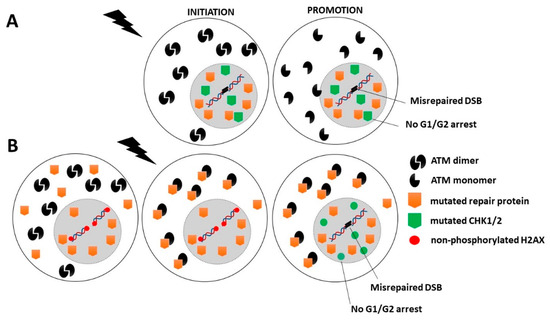 Literature data and this review suggest that carcinogenesis and cell transformation require both misrepaired DNA damage that generates DNA sequence errors and impaired cell cycle checkpoint control that facilitates cell proliferation and therefore errors propagation. These two steps are consistent with the hypothesis of initiation and promotion steps proposed by several oncologists [111]. As evoked above, the cancer and radiosensitivity syndromes described in this review may be therefore classified into three categories (Figure 2):