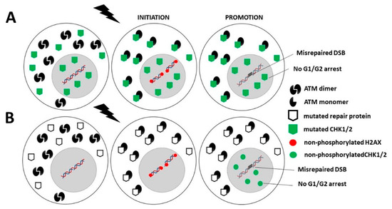 Category 1: Two subcategories can be considered. In the first one, mutations of crucial genes directly involved in the DNA damage recognition, repair and signaling that do not result in an embryonic state (such as ATM and LIG4 mutations) produce a level of misrepaired DNA breaks and genomic instability that is so high that it also produces mutations in some other genes involved in the cell cycle checkpoint control. The spontaneous (p14; q11) chromosome exchanges currently observed in ATM-mutated cells are a representative example of cytogenetic events that may concern more than one gene [32,33,247]. In other terms, in this category of cancer syndromes, the initiation and promotion steps may occur concomitantly [4,18]. This is notably the case of ATM- and LIG4-mutations (Figure 4A and Table 1). In the second subcategory, the mutations of less crucial DNA damage recognition and repair genes may result in high cytoplasmic expression of the gene products (as X-proteins). Such expression of X-proteins may lead to delayed RIANS, which limits DSB recognition through incomplete γH2AX phosphorylation and G2/M and G1 arrests through incomplete CHK1 and CHK2 phosphorylation. Hence, in this subcategory, the mutated protein, as an impaired contributor of DNA damage recognition and repair, favors errors formation, while the mutated protein, as an X-protein, delays the RIANS, which favors their propagation via impaired phosphorylation of cell cycle checkpoint control proteins. This is notably the case of some XPD mutations (Figure 4B, Table 1).