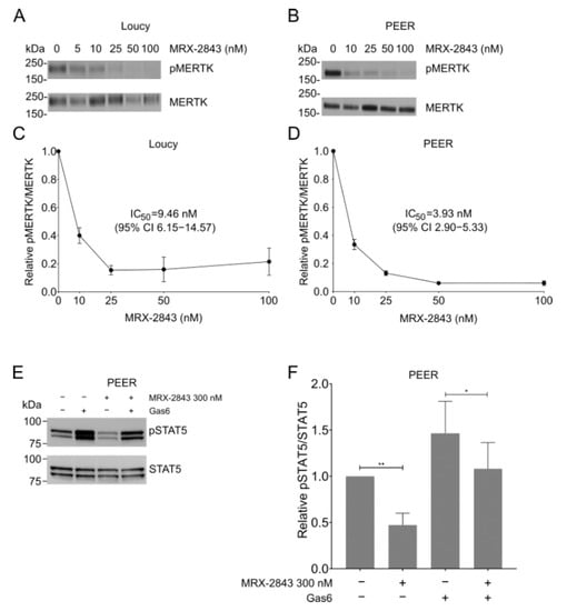 MERTK was active in both the Loucy (Figure 2A) and PEER (Figure 2B) cell lines, as indicated by detection of phosphorylated MERTK (pMERTK) in the absence of MRX-2843. Furthermore, treatment with MRX-2843 inhibited auto-phosphorylation of MERTK in a dose-dependent manner in both the Loucy (Figure 2A,C) and PEER (Figure 2B,D) cell lines. Decreased phosphorylation was seen at concentrations as low as 10 nM, with near-complete inhibition at 100 nM. MRX-2843 inhibited MERTK activation with IC50 values of 9.5 nM (95% confidence interval (CI) 6.2–14.6) in the Loucy cell line (Figure 2C) and 3.9 nM (95% CI 2.9–5.3) in PEER (Figure 2D). Additionally, MERTK inhibition decreased downstream signaling via STAT5 in PEER cells (Figure 2E,F). Treatment with 300 nM MRX-2843 reduced STAT5 activation by 53% (p = 0.0093) in the presence of FBS, which contains the MERTK ligands GAS6 and PROS1, and by 38% (p = 0.0465) when additional GAS6 was added to the culture to provide an acute stimulus (Figure 2E,F). Similar assays were attempted with Loucy cells but pSTAT5 was not detected (data not shown). Similarly, although we previously demonstrated reduced activation of AKT and ERK in response to MERTK inhibition in non-ETP T-ALL models [14], pAKT and pERK were not phosphorylated in PEER cells, and treatment with MRX-2843 did not affect pAKT and pERK levels in Loucy cells (data not shown).