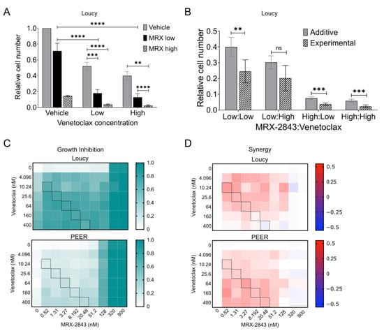 MRX-2843 and venetoclax mediate synergistic anti-leukemia activity in ETP-ALL cell lines. (A,B) Loucy cells were plated in triplicate at 20,000 cells/well and cultured for 24 h before treatment with vehicle, MRX-2843 (low = 62.5 nM, high = 125 nM), venetoclax (low = 250 nM, high = 500 nM), or MRX-2843 and venetoclax combined for an additional 48 h. After treatment, cells were stained with CellTiter-Glo reagent, luminescence was measured, and cell numbers were calculated relative to the DMSO control. Mean values ± SEM were derived from four independent experiments. For (B), expected additive values were calculated using the fractional product method and compared with experimentally observed values (** p ≤ 0.01, *** p ≤ 0.001, **** p ≤ 0.0001, unpaired t-test). (C,D) ETP-ALL cell lines (Loucy and PEER) were treated in quadruplicate with pairwise drug combinations of MRX-2843 and venetoclax, and relative cell numbers were determined utilizing a high-throughput platform and the CellTiter-Glo readout. (C) Relative growth inhibition was calculated by subtracting background luminescence and normalizing to vehicle controls. (D) Synergy was calculated using the Response Additivity model. Values >1% indicate synergistic, values < −1% are antagonistic, and all others are additive. Black boxes in (C,D) represent combinations of MRX-2843:venetoclax at a 1:20 dose ratio. Abbreviations: ns – not significant.